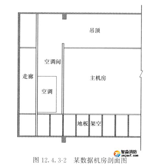 图12.4.3-1、图12.4.3-2所示分别为某数据机房的平面图及剖面图,在数据机房中经常会遇到空调间与主机房看似分隔,而架空层和吊顶层却是相通的情况,空调系统采用下送风、上回风的气流组织方式,此时需将空调间和主机房视为一个防护区,此防护区容积=(S空调间十S主机房)X(h吊顶层十h净高十h架空层)。