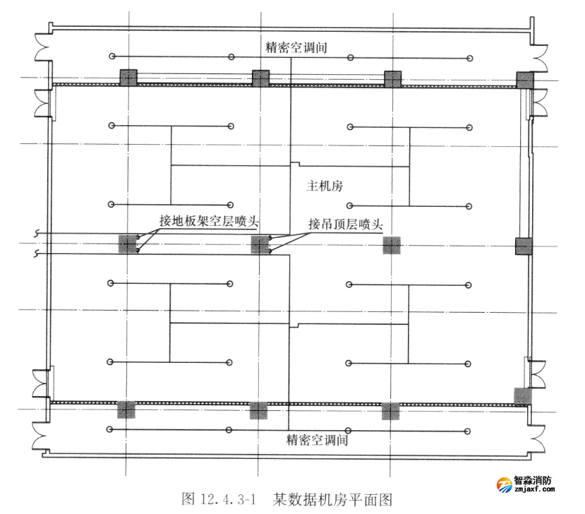 图12.4.3-1、图12.4.3-2所示分别为某数据机房的平面图及剖面图,在数据机房中经常会遇到空调间与主机房看似分隔,而架空层和吊顶层却是相通的情况,空调系统采用下送风、上回风的气流组织方式,此时需将空调间和主机房视为一个防护区,此防护区容积=(S空调间十S主机房)X(h吊顶层十h净高十h架空层)。